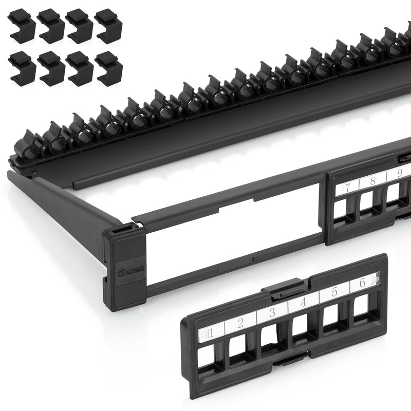 This 24-port blank keystone patch panel supports slim-profile keystones like RJ45, USB, and HDMI. Its modular 6-port design allows easy access and adjustments without disassembly. It helps declutter cables for better organization, while removable writing tags and bold numbering make identification quick. The adjustable cable management bar fits various wire sizes, and it installs easily in standard 19” racks with all mounting hardware included.