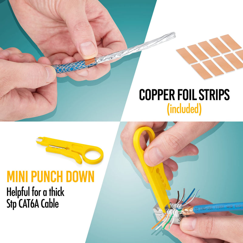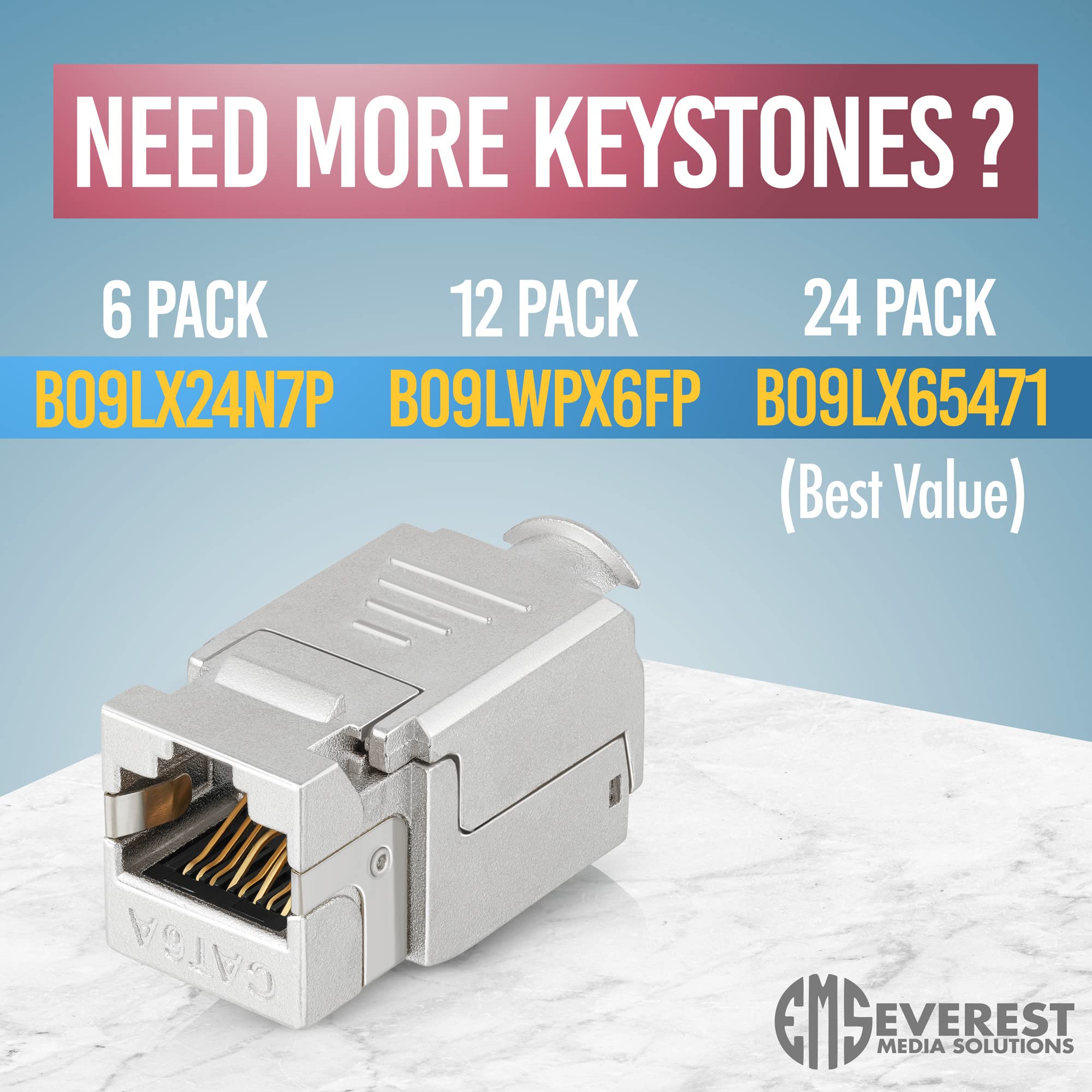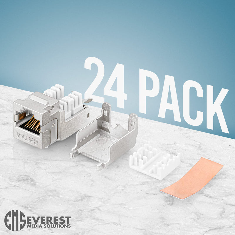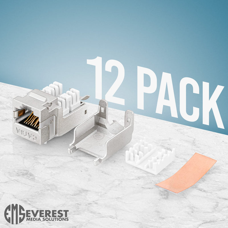 Everest Media Solutions RJ45 Shielded Keystone Jacks (6-Pack) are slim-profile, 90° F/STP female connectors tested for CAT5e, CAT6, CAT6A, and CAT7 with speeds up to 10Gb. Designed for CAT6A shielded cables but backward compatible with CAT6 and CAT5e, they feature an easy-to-follow color-coded wiring guide and support fast terminations using the easySHIELD Speed tool. Their slim build fits most wall plates and patch panels, making them ideal for tight spaces. Available in packs of 6, 12, or 24, these keystone jacks provide reliable performance for both home and office setups.